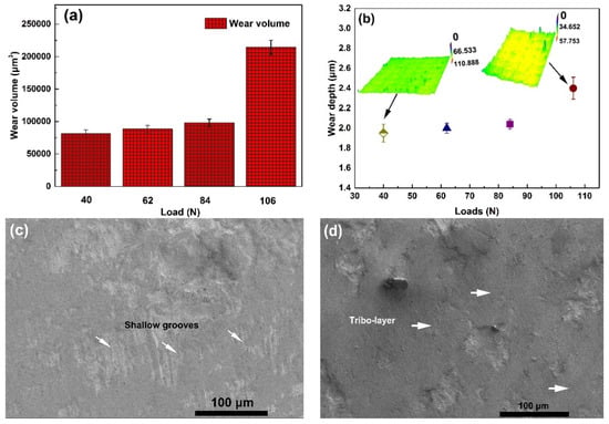 Fretting wear is quantified according to a change in wear volume of the fretting wear track, as shown in Figure 8a. All the wear volume tests were carried out at the same condition for three times, yielding standard error bars. The 3D optical microscope is used to measure the wear volume and depth after fretting tests. For testing at 40–86 N, a slight increase in wear volume proves the mild wear in the wear surfaces. Since increment of wear volume is relative pronounced at the highest load of 106 N, the wear still remains slight. The critical load, at which the transition from mild to severe wear occurs, is primarily a material property [,,,,,,,,,,,,,,,]. The propagation of cracks which can result in the significant wear becomes more difficult as the fracture toughness of the material increases. Therefore, it can be inferred that the AM-Inconel 625 would show a high fracture toughness, leading to the superior wear-resistance at varying load condition.