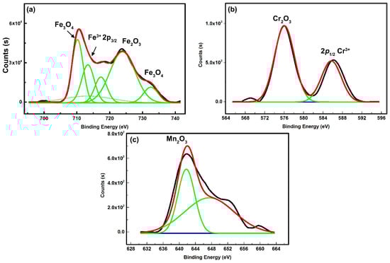 In order to get reliable chemical and structural information from the wear tracks of AM-processed Inconel 625, high-resolution XPS spectra obtained on the tested roller specimens are shown in Figure 9. All the spectra were first calibrated from the C 1s peak at binding energy of 284.4 eV from the NISTXPS database. Additional smoothening was done by the Savitzky-Golay method. The background of the spectra was then subtracted followed by fitting on multiple peaks using the Voigt function. Considering the material transfer from the counterpart (42CrMo4 stainless steel), the Fe 2p core level spectrum of the tribo-layer is shown in Figure 9a, which could be deconvoluted into five components. The peak at 712.2 eV [] corresponds to Fe3O4 which is formed through oxidation during the fretting wear, while the peak at 713.3 eV corresponded to 2p3/2 of Fe3+ oxidation state []. The Fe 2p3/2 peak at 717.3 eV suggests the existence of Fe2+ and Fe3+ in wear tracks []. The peak at 724.0 eV [] is identified as Fe2O3, while 732.5 eV is Fe3O4 []. The existence of both Fe2O3 and Fe3O4 in the tribo-layer confirms that the observed material transfer with tribo-oxidation reaction plays an important role in the formation of the tribo-layer. Figure 9b shows the Cr 2p core level spectra for the wear track of AM-processed Inconel 625. The peak at 576.1 eV [] is identified as Cr2O3, while the one at 585.7 eV is identified as Cr3+ 2p1/2. The Mn 2p spectra of the wear track are shown in Figure 9c. A peak position is obtained at 641.7 eV [] which corresponds to the oxidation state of Mn2O3. The aforementioned results demonstrate that the well adhering tribo-layer is mainly composed of mixed oxides. Such layer is normally characterized by a nano-scale structure. Kato and co-workers [] reported the formation of similar metal oxide nano-particles on the wear track and found that a mild wear regime could be established for those oxides with the higher diffusion coefficients and observed coherent tribo-films. Therefore, the high wear-resistance observed on the AM-processed Inconel 625 shows strong dependence on the good mechanical properties including superior tensile and yield strengths, high hardness, as well as the nature of the tribo-layer formed during fretting wear.