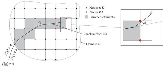 In order to account for the presence of the discontinuity, the element formulation is enriched for the elements concerned by the crack. Let I be the set of all the nodes within the domain Ω and J be the set of all the nodes belonging to the enriched elements, excluding the one containing the crack tip, which is assigned to the set K. The nodal variable (e.g., displacement) can, therefore, be represented by [1]:
