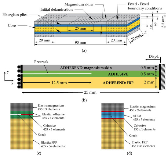 The overall model’s specimen dimensions are 150 mm × 25 mm × 9 mm, with the initial crack length of 50 mm embedded within the mid-plane of the adhesive, in one end of the specimen, (see Figure 3a). This model is a simplification of the hybrid composite used for the experimental tests, consisting of a hybrid magnesium sheet and FRP forming the upper adherend, and biaxial FRP forming the lower adherend. It should be noted that, to further simplify the analysis (without compromising the overall accuracy), each of the two 4-mm thick adherends was homoginzed into an equivalent elstic material. In this way, the equivalent materials had the same flexural stiffness as the combined hybrid materials, but the analysis would concume significantly less CPU. The adopted scheme also facilitates more effective debugging. The 1-mm thick adhesive layer was modeled in three ways, by using (i) a combination of elastic and cohesive elements, as shown in Figure 3b, (ii) xFEM elements only, as shown in Figure 3c, and (iii) a combination of xFEM and cohesive elements, as shown in Figure 3d. These models are referred to as COHESIVE, XFEM, and MIXED, respectively, hereafter. The same cohesive material model was used in conjunction with both cohesive and xFEM elements; moreover, the xFEM elements were also assigned elastic model properties. In other words, the elements defined as xFEM would initially behave elastically until the stresses reach to a level at which xFEM’s enrichment is activated, thereby using the assigned cohesive properties. It should be noted that one could also assign other material models (e.g., elasto-plastic) to the xFEM elements instead of the elastic model [32].