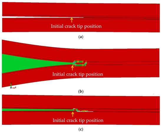 Qualitative comparison of the crack propagation under the DCB test predicted by the various models (a) COHESIVE, (b) XFEM, and (c) MIXED. For the sake of clarity, only the zone near the crack tip is shown.