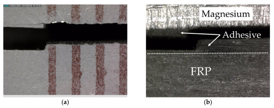 Close-up views of the crack propagation in the DCB, in which a magnesium skin is bonded to an epoxy/fiberglass composite, using a 0.2 mm thick layer of epoxy resin. Specimen (a) with the white coating used for monitoring crack propagation and (b) without the coating.
