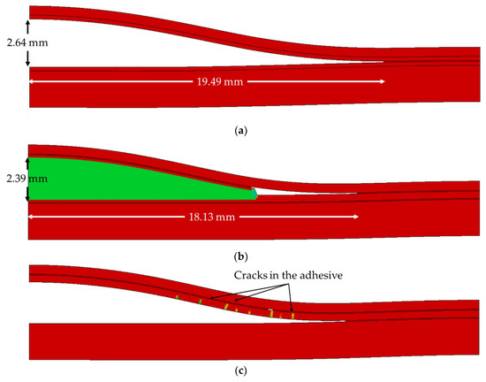 Delamination propagation and resulting deformed shapes captured by the (a) COHESIVE model, (b) MIXED model with initial delamination at the mid-height, and (c) MIXED model with initial delamination at the lower interface.