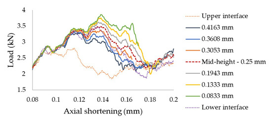Axial-load shortening curves produced by the MIXED model for case studies having various through-thickness positions of the initial delamination. Note that the first portion of the graphs has been omitted for clarity, as it is the same for all the cases.