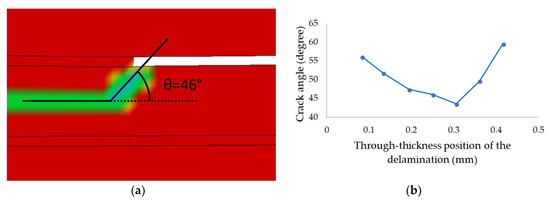Another interesting phenomenon observed during this phase of the study is the change in the ensuing delamination kink angle. This angle is defined as the angle between a hypothetical non-kinked delamination path and the delamination orientation after it kinks, as shown in Figure 10a. Note that for the reasons mentioned earlier, only the variation of the delamination in the xFEM elements could be considered.
