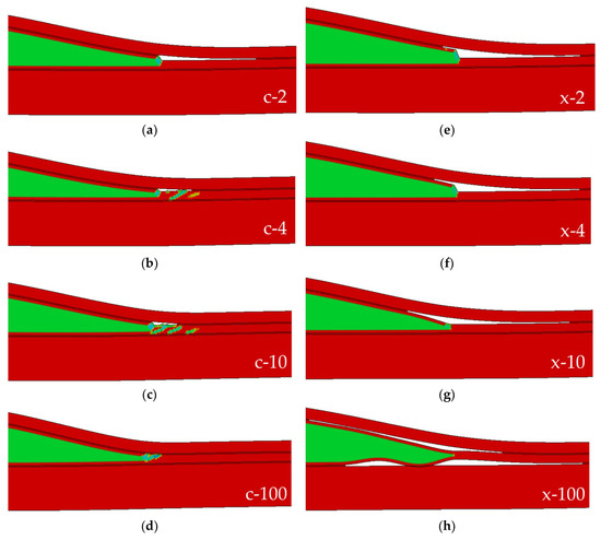 As seen, the higher is the adhesive strength, the more difficult would be for the delamination to propagate along the interface. This results in the evolution of successive cracks, all having the same inclination. However, an apparent limit is reached when the base strength approaches a relatively large value (i.e., c-100), in which case the delamination would no longer propagate longitudinally, leading to extensive local damage at the delamination tip. Note that the delamination initially kinks towards the upper interface but could not propagate within the cohesive elements due to the high traction strength. Moreover, due to the limitation of the xFEM formulation, the delamination was not capable of propagating along the interface of xFEM/cohesive elements either. This resulted in the development of successive delaminations parallel to the initial delamination. Of interest is also the behaviors of models x-2 to x-10. In these models, the delamination propagated towards the interface, and then traveled along that interface in both forward and reverse directions. This response became increasingly noticeable as the base strength was increased, which is facilitated by the comparatively lower interface strength. In the extreme case (x-100), where the interface strength is significantly weaker than the traction strength, the adhesive detaches almost completely from both neighboring materials. Note that the minute interpenetration seen in model x-100 (see Figure 11h) is the result of the failure of the cohesive elements, and the absence of a contact algorithm. It should be noted that incorporation of an appropriate contact algorithm would have increased CPU consumption significantly, resulting in no appreciable benefit in terms of further understanding of the behavior.