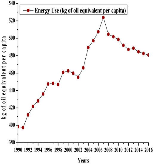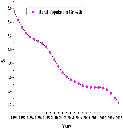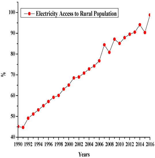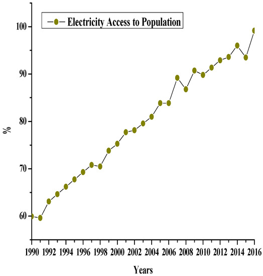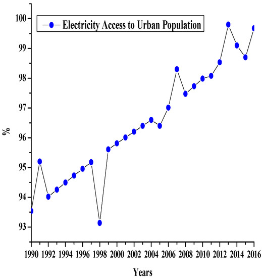 The electricity access of the total population, electricity access of the rural population, electricity access of the urban population, energy usage, population growth, and rural and urban population growth from 1990–2016 is illustrated in Figure 1, Figure 2, Figure 3, Figure 4, Figure 5, Figure 6, Figure 7 and Figure 8, and data was taken from the WDI (World Development Indicators).