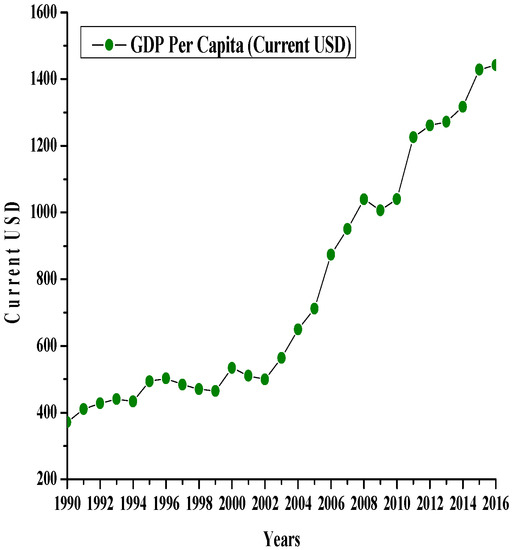 The supply of electricity in the rural communities contributes to economic growth, leading to improvements in agriculture, education, health, gender equality, and sustainable development [24,25]. Outdated equipment, improperly installed capacity, an inability to operate transmission systems, and deprived monetary administration are the main reasons behind the failure of the electricity sector in Pakistan [26,27]. The shortage is due to the lack of political instability and large investment, which has hindered the hydropower or coal projects, thereby increasing the dependence on imported expensive fuels and plummeting the local natural gas [28]. The country’s growing population, industrialization, and average household income have contributed to the growth in the demand for electricity [29]. Social and economic progress depends on energy flow. Currently, the country is producing insufficient energy and thus is facing a crisis. Despite renewable energy sources, traditional energy generation methods are still being used in Pakistan. In the present period, energy efficiency has amplified, but the energy generation systems have not been updated to fulfill the energy requirements [30,31]. The electricity deficit in 2013 was of 6000 megawatts (MW), which is more than the usual 4000–5000 megawatts per year, and the gross domestic product (GDP) declined by 3–4% due to the energy crisis. The crisis has seriously affected the economy of Pakistan as a result of industry closures [32,33].