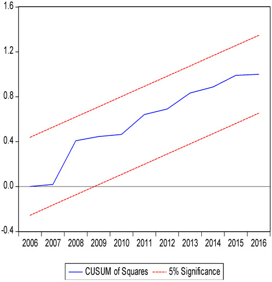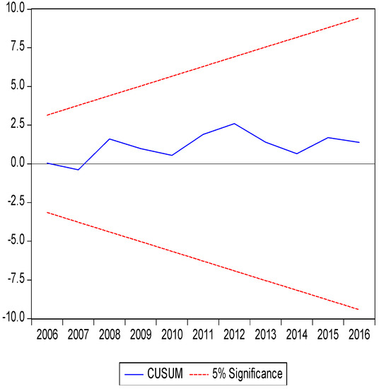 where Δ indicates the difference operator, represents the constant intercept, indicates the coefficients of long-run, while indicatesthe coefficients of short-run. The long-run co-movement among the variables of interest is ascertained on the basis of the estimated F-statistic. Pesaran et al. (2001) constituted two values available for the test of cointegration: first, the critical values of lower bound, where the variables are integrated of order zero I(0), and secondly, the critical values of the upper bound; where the variables are integrated of order one I(1). The hypothesis of no presence of long-run association is excluded if the F-statistic estimation exceeds the critical values on the upper bound. Hence, we use the small sample critical values provided by Narayan (2005) [69]. Eventually, this empirical study investigates the long-run elasticity and short-run adjustment parameters in Equation (5).