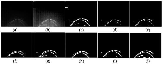 In Reference [], a new approach was proposed, and it achieved significantly better segmentation accuracy compared to the past research [,,]. It comprises several novel image processing algorithms: A difference operation, a two-dimensional spline fitting enhancement operation, a gradient feature detection filter and the slope difference distribution-based threshold selection. The major goal of [] is to cluster and characterize the laser lines under extremely harsh welding conditions. As a result, it omits the image processing methods for the images captured under less harsh welding conditions with mild welding parameters. In addition, quantitative results and comparisons to validate the effectiveness of the proposed segmentation approach were also not given. Due to the page limit, the reasons why the segmentation approach should contain these image processing algorithms were not explained adequately. One goal of this paper is to complement the research work conducted in Reference [] and conduct a more thorough experiment to find the most effective solution both qualitatively and quantitatively. Another goal is to come up with more efficient segmentation approaches for images with relatively high quality that are captured under mild welding parameters.