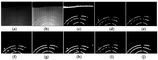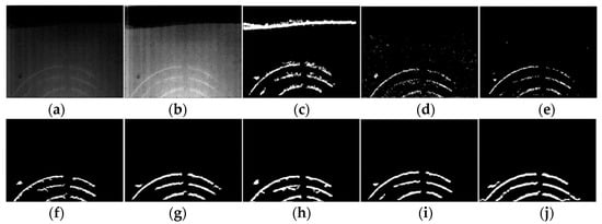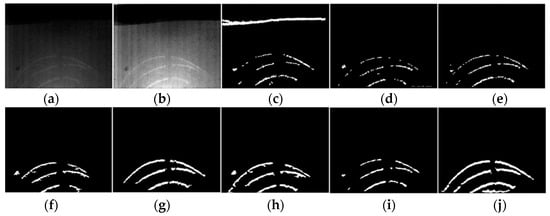 where  denotes the opening operation,  denotes the image and  denotes the structuring element.  is chosen as a disk with radius 15 in this research work. After the image was enhanced by the top-hat transform, the image was segmented by the threshold selection method. The selected welding parameters are as follows. The wire feed speed is 55 mm/s, the welding speed is 5 mm/s, the peak current is 220 A and the base current is 50 A. As a result, the captured image is very clear for segmentation. However, their segmentation result still misses significant parts for the laser lines.