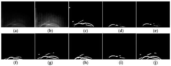 Performance comparison of the eight methods with image 10; (a) original image; (b) filtered image; (c) approach 1; (d) approach 2; (e) approach 3; (f) approach 4; (g) approach 5; (h) approach 6; (i) approach 7; (j) approach 8.