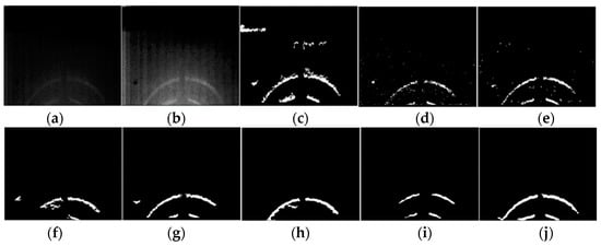 Figure 2a shows a typical image captured by the structured light monitoring system with the following welding parameters. The wire feed speed is 84.67 mm/s, the welding speed is 3.33 mm/s, the peak current is 230 A and the base current is 70 A. As can be seen, these parameters are significantly higher than those used in References [,]. With these parameters, the resultant weld pool surface changes more rapidly and irregularly. Hence, the quality of the captured image in this study is much reduced. The results by top hat method, FFT method, difference method, GLCM method and combination method are shown in Figure 2b–f respectively. Compared to the segmentation result by combination method, the segmentation results by other state of the art methods appear to be very inaccurate. Although the difference method achieves the second best result, there is one big segmented line on the top caused by the edge of the imaging plane. It costs additional effort for the subsequent unsupervised clustering. In addition, there are noise blobs that are hard to be distinguished from the laser line parts.