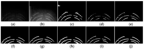 Performance comparison of the eight methods with image 5; (a) original image; (b) filtered image; (c) approach 1; (d) approach 2; (e) approach 3; (f) approach 4; (g) approach 5; (h) approach 6; (i) approach 7; (j) approach 8.
