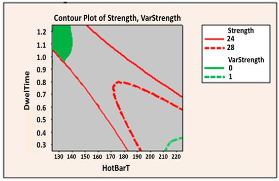 RSM uses different techniques for optimization purposes, such as the contour plots, which allows to visually identify an area of compromise among the response variables. In Figure 1, it shows as an example for this technique a simultaneous optimization; the green region in the plot is the feasible region that satisfies the criteria for Strength value between 24 and 28 and VarStrength value between 0 and 1.