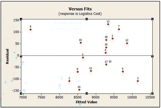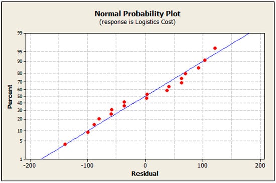 - Residuals analysis is performed to determine how good the fitted model is. This analysis helps to determine if the ordinary least square assumptions are met to produce unbiased coefficient estimates with minimum variance. The residual Normal Probability Plot is in Figure 3, the points on the plot form a straight line, therefore it can be confirmed residuals are normally distributed. In Figure 4 shows residuals are distributed randomly and with similar distance on both sides of zero, therefore there are no outlier points, as well as, the plot confirms the equal variance assumption on the model. Therefore, it can be concluded that data transformation is not required.Figure 3. Residuals Normal Probability Plot for Logistic Cost.Figure 4. Residuals versus Fits Plot for Logistic Cost.