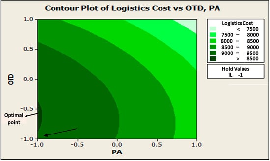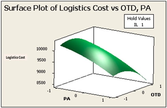 - The empirical mathematical model can be evaluated through the Response Surface and Contour Plots; which are visual tools for interpreting the result of the CCD. The Surface Plot in Figure 5 indicates the CCD model reaches a maximum logistics cost when PA is at low level as well as OTD, keeping blocked the IL at high level. In Figure 6, the contour plot is reflecting that the stationary point (Maximum) for the model is out of the experimental region, therefore a canonical analysis can be performed in order to determine the optimal point of the model. In this step, it can be validated that current logistics operations are according to the results of the model.Figure 5. Surface Plot for Logistic Cost.Figure 6. Surface Plot for Logistic Cost.