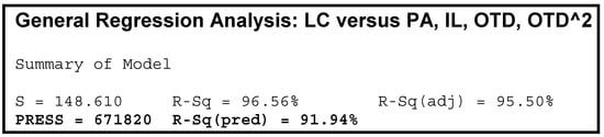 Software Minitab®, was used to calculate the value for each coefficient included in the empirical mathematical model represented by the Equation (7), this needs to be validating to determine if it is a good estimator for the response variable. This model is represented by a regression model with a second order equation. The following concepts are analyzed (where X1 = PA, X2 = IL, X3 = OTD):