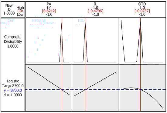 Other technique is the desirability function analysis popularized by Derring and Suich [], where response variables in simultaneous optimization can be maximize, minimize or set to a particular target. Therefore, the first step is to determine the individual desirability index (di) based on the expected characteristics of the response variable. There are three ways to calculate di; Equation (4) is applied when a particular target is required. Then, the composite desirability (dG) must be determined through the combination of all individual desirability indexes to form a single value; as seen in Equation (5), this is applied for this purpose. The highest dG value is the one that determines the optimal parameters and its level combination for response variable optimization. The Minitab software supports both techniques and facilitates the statistical analysis.