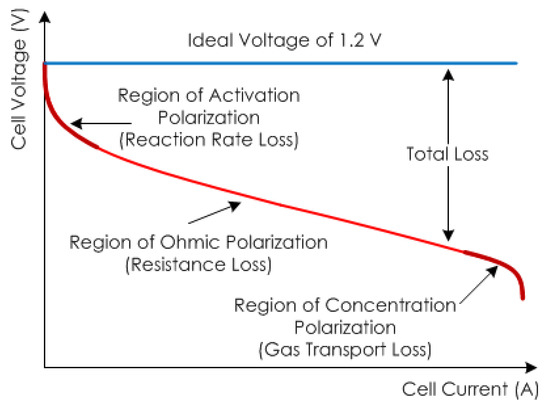 However, in practice as shown in Figure 2, the potential of the PEMFC is significantly less than the values of the theoretical potential, which is given in the above equation, due to the existence of losses, including polarization and interconnection losses. According to [63], the main voltage losses in a PEMFC are the electric losses, which can be classified into three main polarization losses: the activation polarization losses , the ohmic polarization losses , and the concentration polarization losses . Therefore, the voltage of an individual cell can be calculated as [64]