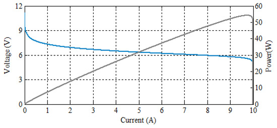 The resulting polarization curve of a typical PEMFC showing the voltage and power characteristics are shown in Figure 3. These curves are obtained by using the PEMFC model developed in [64]. Thus, 10 unit cells are connected and stacked in series to attain the required power.