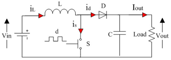 According to [65,66], the relationship between input and output voltage in a boost converter is presented by Equation (15), where is the input voltage source, is the output voltage, and d is the control signal which represents the switch position: