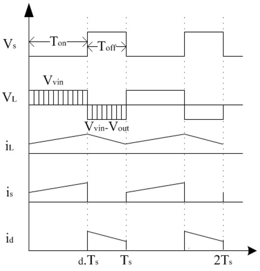 Under continuous conduction mode (CCM), the operation of a DC–DC boost converter becomes fairly simple. Thus, using the inductor L and the two switches D and s, the circuit alternates between two states (ON and OFF) for each complete switching cycle . Each state of ON and OFF has a varying duration. The ON time can be calculated by multiplying the switching cycle with the duty cycle d. The OFF time can be found by subtracting the ON time from the complete switching cycle . The waveforms of inductor current , inductor voltage , switching current , switching voltage , and diode current are shown in Figure 5.