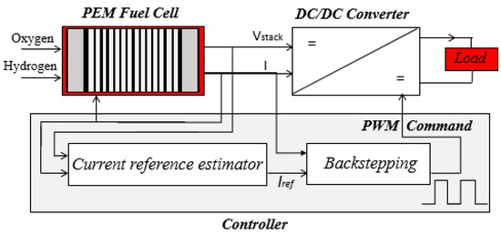 The backstepping technique has recently attracted considerable attention. It is a recursive design methodology developed in 1990 by P. V. Kokotovic and his coauthors for designing stabilizing controls. It has become an important robust algorithm due to its ability to control chaos and its flexibility in the construction of control law. It is commonly used for numerous applications, especially nonlinear uncertain systems (e.g., PEMFC power systems) [48,49,50,51,52,53,54,55,56,57,58,59]. In [48], it is used for a smart grid-connected distributed photovoltaic system. It is designed to track the PV array maximum power point in order to power up the telecom towers. Similarly, it is also proposed in [49,50] to track the MPP reference voltage, which is generated using the incremental conductance algorithm. In [51], it is used to adapt the turbine speed at its maximum generator speed value. However, pitch control and proportional–integral (PI) regulators are used to determine the optimal specific speed at which the turbine generates its maximum power. In [55], it is proposed for a PV water desalination system. It dissipates the maximum produced power in a resistive load to generate heat, which is then used for the desalination process. In [59], it is proposed to reduce the steady state error, which degrades the efficiency of the MPPT controller. The authors used a regression plane to determine the reference voltage, which corresponds to the peak power.The current paper proposes a new MPPT method based on a backstepping algorithm to keep the system functioning at its optimal power point. The main feature of this method is its simplicity, robustness, and high tracking performance, confirmed by the obtained results. The global system including the fuel cell, the DC–DC converter, and the controllers are presented, modeled, identified, and then tested under a Matlab–Simulink environment. The obtained simulation results are analyzed and discussed. Finally, some conclusions are made and future works are suggested.