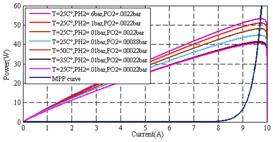 The aim of this step is the determination of the reference current for different operating conditions. According to Figure 7, it is clearly shown that the performance of the PEMFC is largely influenced by the variation made on hydrogen, oxygen, and temperature. Thus, the hydrogen operating pressure varied from 0.01 to 0.6 bar, and oxygen operating pressure varied from 0.00022 to 0.0022 bar, while the operating temperature T varied from 25 to 50 C. When and are equal to 0.01 and 0.00022 bar, respectively, the power generated by the PEMFC is at the lowest value compared to the pressure of other gasses. On the other hand, once and increase to 0.6 and 0.0022 bar, respectively, the power produced by the PEMFC is at the highest value. Consequently, the efficiency of the PEMFC is improved by rising the partial pressures. Besides, the efficiency of the PEMFC may also be improved by raising its temperature. However, compared to the influence of the partial pressure, the PEMFC is not largely influenced by its temperature variations.