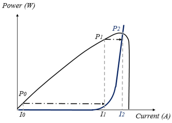 Figure 9 clarifies that, for any operating power point, after several projections, the PEMFCs will be managed to operate at the desired point and then extract the maximum power from the PEMFC. For instance, suppose that the system works at . The projection of this power point onto the blue curve will change the operating current from to . As a consequence, the system will be working at . By applying the same process on the operating power point , the system will be brought to operate at , which is closer to the MPP. After several projections, the operating power point will change repeatedly until it reaches the MPP where the reference current equals to . The main feature of this method is that we can keep the fuel cell working at its MPP with great performance.
