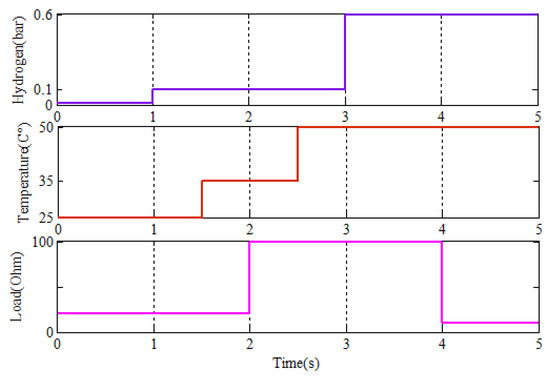In order to verify the performances of the proposed MPPT method, variations in temperature, hydrogen, and load resistance are applied at different times. Thus, as shown in Figure 13, load resistance variations are performed at and s, from 20 to 100 , and from 100 to 10 , respectively, temperature variations are performed at and s, from 25 to , and from 35 to , respectively, and hydrogen variations are performed at and s, from to bar, and from to bar, respectively.