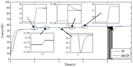 The PEMFC stack power curves are shown in Figure 16. Compared to the nominal characteristics of the PEMFC, an improvement of 12% in the fuel cell power is obtained using the proposed MPPT control scheme. In addition, although the extracted energies using the two controllers gives almost identical results (with a slight advantage for the backstepping algorithm), it is clear that, when using the backstepping technique, the MPP is obtained with high-performance motion tracking. On the other hand, in addition to its complexity, it is clear that the drawback of the PI controller is its weakness when facing load resistance variation. Consequently, the validity of the backstepping algorithm and its robustness under load resistance variations is clear. Moreover, a magnificent performance, with a quick start-up and high tracking accuracy, is obtained, even for large system parameter variations.