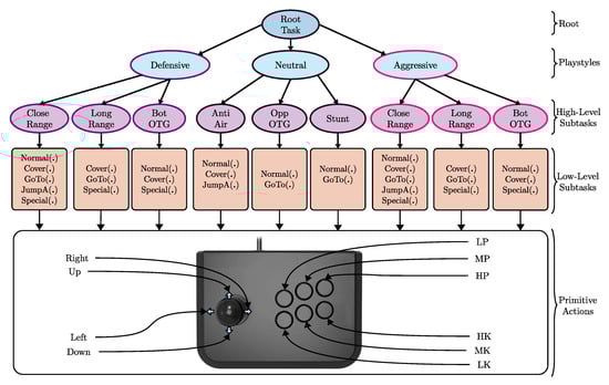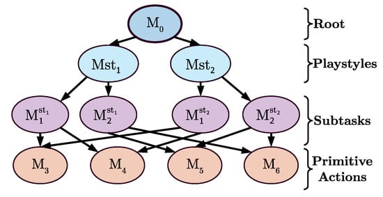 As we can see in Figure 2, the playing style layer includes the child nodes of the root MDP . The set of nodes in the subtask layer below is . The subscript in this naming notation represents the sub-problem it is intended to solve, while the superscript indicates the archetype behavior for the agent. Thus, the subtasks are designed to tackle the same state–action space, and achieve the same goal, but with different approaches.