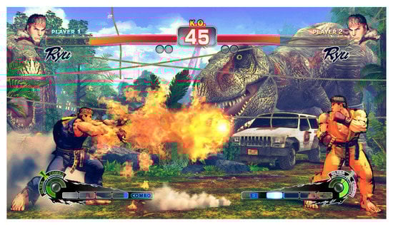 Furthermore, creating believable bots for SFIV represents an especially challenging task. This difficulty arises from the fact that both players are always on screen in fighting games, making it harder to maintain the illusion of an agent being controlled by a human player. In contrast, in the FPS named Unreal Tournament—the testbed for the BotPrize Competition []—the judges and players participating in the Turing test only have a few moments to examine how their opponents play and react to the environment. Therefore, SFIV represents a more advanced challenge for the creation of believable bots.