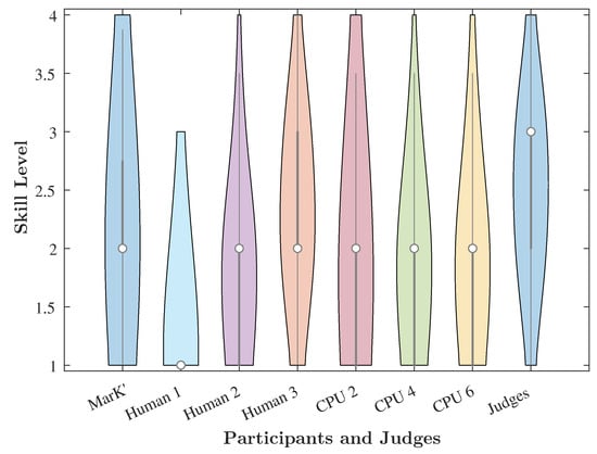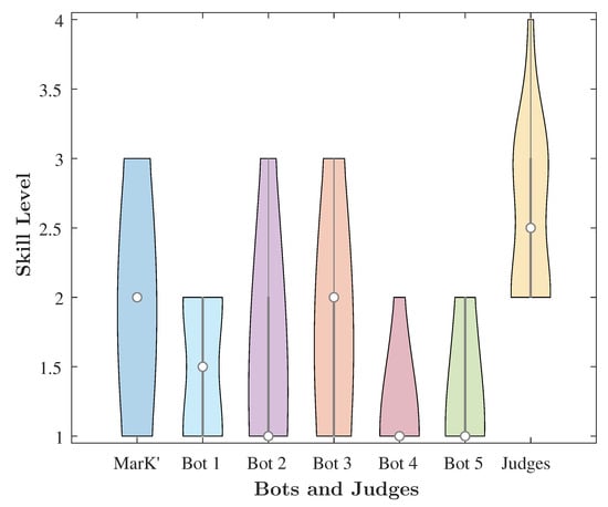 In the same manner as presented in Section 7.2, we computed the human-likeness ratios for the six bots in the believability test; these ratios are presented in Figure 8. Furthermore, we applied the same statistical significance analyses presented in Section 7.2. We report the estimated p-values and CIs in Table 3. In regards to performance, we present in Figure 9 a violin plot for each participant in this survey. In addition, this plot includes the self-assessment skill level of the judges.