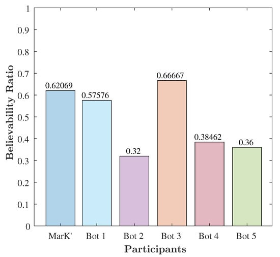 In this section, we present the implemented experiment that are aimed to better understand the individual contribution of HRLB⌃2’s modules to the human-likeness and performance of MarK’. For this experiment, we could collect 97 responses of people that participated as judges. Furthermore, the main results of this study are presented in Figure 8 and Figure 9 and Table 4.