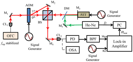 Because the frequency of the first-order beam was shifted by fAOM, a heterodyne interference signal was detected by the photodetector (PD, Model 1811, New Focus, CA, USA), and the frequency of the heterodyne interference signal was fbeat = fAOM − frep = 2 MHz. The beat signal was extracted by a bandpass filter and then sent into a lock-in amplifier (SR844, Stanford Research System, Sunnyvale, CA, USA) to measure the phase compared with the reference signal.