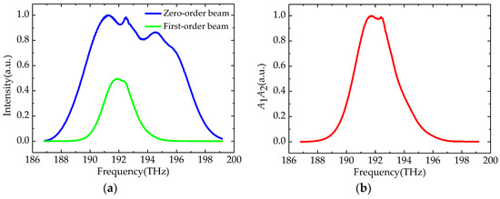 The output laser beam from the OFC passed through an acousto-optic modulator (AOM, MGAS80-A1, AA Opto Electronic, Orsay, France) driven by a sinusoidal signal at a constant frequency fAOM = 80 MHz. After the AOM, the zero-order beam travels along the original direction with the original frequency, while the first-order beam spreads in another direction due to optical diffraction, and its frequency is shifted by fAOM. The zero-order beam travels through a beam splitter (BS) and arrives at mirror M3, then reflects back to BS and overlaps with the first-order beam which is adjusted by mirror M2. Two beams were coupled into an optical fiber together by a collimating lens (CL2). The optical lengths of the two beams were set to be equal. The optical spectra of the two beams were then individually measured by an optical spectrum analyzer (OSA, AQ6370C, Yokogawa Electric, Musashino, Tokyo, Japan). The first-order beam is referred to as the reference arm, while the zero-order beam is called the measurement arm. Figure 2a illustrates the optical spectrum of the two arms. Note that the optical spectra of the two beams are different, due to the diffraction of the AOM.