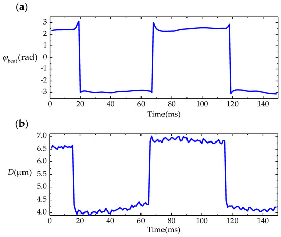 (a) φbeat change with time measured by lock-in amplifier; (b) displacement change with time measured by commercial interferometer.