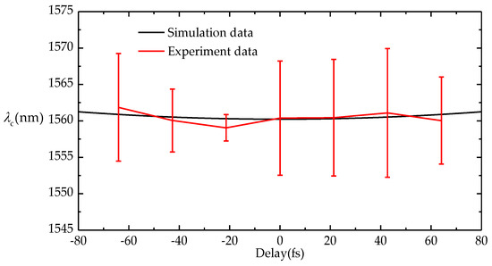 Effective center wavelength λc with different pulse delay. The data was measured by scanning the mirror M3 through modulating the voltage of PZT. Black line: results of simulation; red line: results of experiments. Error bars represents +/− σ (standard deviation) for 10 measurements.