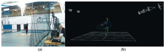 The 3D motion capture of hammer throw. (a) The set-up of the data collection; (b) a sample of the 3D data.