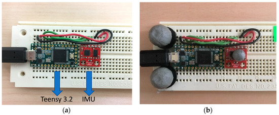 (a) Teensy 3.2 and Inertial Measurement Unit (IMU) connected on a breadboard; (b) Teensy 3.2 and IMU connected on a breadboard with motion capture markers.