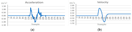 (a) The acceleration data obtained from the IMU sensor; (b) the corresponding velocity data, which was calculated by the complementary Kalman-based filter.