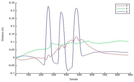 The result of the test by applying Madgwick’s filter is satisfied. During a test, we moved our system device up and down three times. As shown in Figure 4, we got relatively accurate feedback of the 3D positioning data. Indeed, the Madgwick algorithm eliminates the drifting error from integrating the velocities. The three different curves stand for the changing distances over time on the X axis, Y axis, and Z axis in a 3D space. The dynamic distance on the Z axis (blue lines) shows exactly three times up and down of the device. The range of vertical movements is ~0.33 m for the first moving-up and down, ~29 cm for the second circle, and ~32 cm for the last one, respectively. The next step is to validate the accuracy of the device.