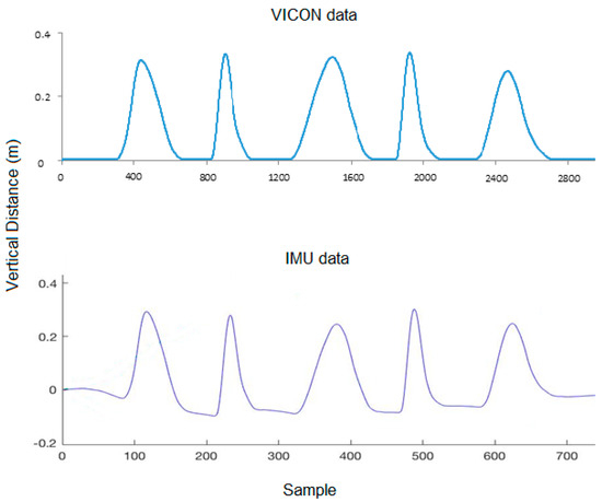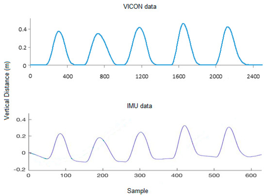 It is well known that 3D motion capture technology provides accurate and objective analysis of a variety of human motor skills [14,24,25,26,27]. Therefore, we employed the synchronized data collection of the IMU and 3D motion capture (Figure 1b) for validating and improving the accuracy of the IMU device. There were eight synchronized tests performed to obtain thousands of data for our validation. Since we aimed to gain the dynamic vertical distance, the validation of the Z axis was selected. Figure 5 shows a typical test data. The synchronized data demonstrate a matching vertical excursion over time between the IMU data and the accurate 3D motion capture data. The results suggest that our device works principally.