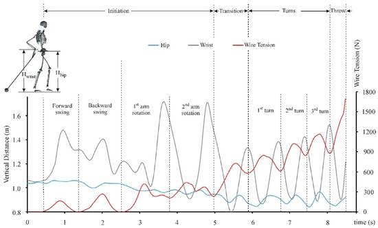 The upper and lower limb coordination (i.e., motor control pattern) revealed by the vertical distances of hip and wrist as well as the wire tension during a hammer throw by a college-level athlete.