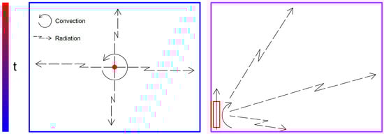 Unfortunately, such a formulation generates a fundamental problem for product comparison, as it does not provide one clear “ideal” emitter to benchmark others against. For ordinary systems where the air temperature is controlled, such an ideal heater is generally described as a dimensionless point (Figure 1). Heat is transferred by convection to the thermal node of indoor air, and by radiation to the surrounding surfaces. A higher convective transfer fraction induces lower surface temperatures on the surrounding surfaces with minimal heat loss, as in Figure 1. To reach the desired air temperature set-point , an emitter with convective fraction of 1 (pure convection) thus requires the lowest possible heat output. In this sense, it represents an “ideal” heater.