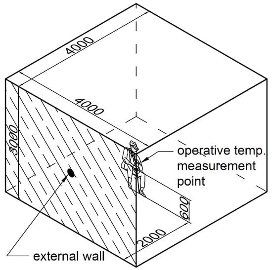 In this study, we consider an enclosure with thermal layer properties and dimensions 4 m × 4 m × 3 m specified by the CEN TC130 European Committee, shown in Figure 2. The external wall has U-value 0.25 W/m K, and heat recovery ventilation in the room provided an air change rate of 1 ACH bwith temperature efficiency 0.8.