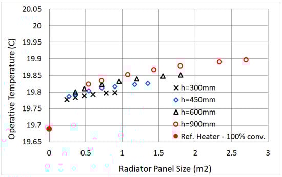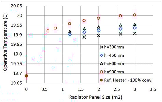 IDA ICE operative temperatures for a 10-type radiator and convector in function of the panel area.