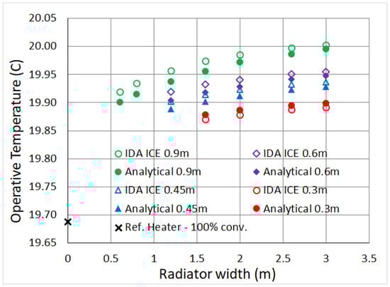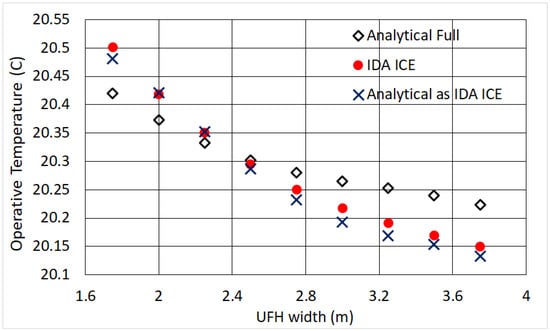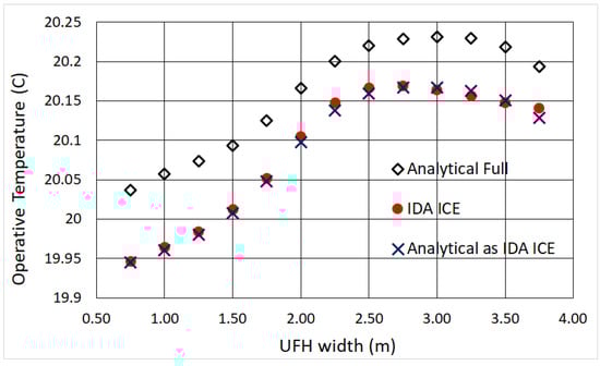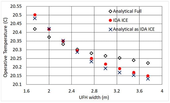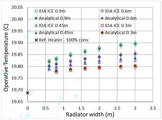 Specifically, in this work all the “Analytical Full” points in the graphs are calculated with Equations (4) and (7), therefore following the ISO standard completely throughout this paper. The only point in common with IDA ICE consists of the surface temperatures , which are written as polynomial interpolations from the data provided by the software. Since both the definitions of operative and mean radiant T are different, the analytical is independent of the numerical .